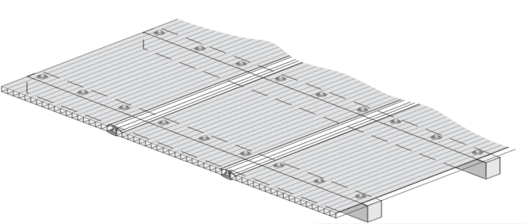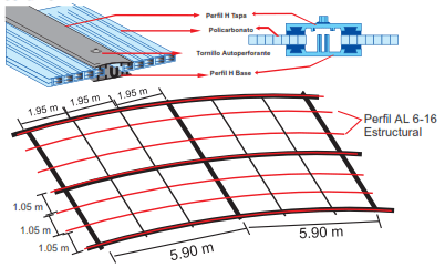 Sistema de perfiles de unión (conectores) de aluminio estructural. No requiere apoyarse sobre una estructura. Se compone de un Perfil Aluminio AL6-16 Base Estructural y un Perfil Aluminio Al 6-16 Tapa Estructural con gomas EPDM blancas (cuatro tiras de gomas). Puede instalarse con luces de hasta 2 metros. Para la unión de los dos perfiles se usan pernos autoperforantes de 1.1/2” ó 2”